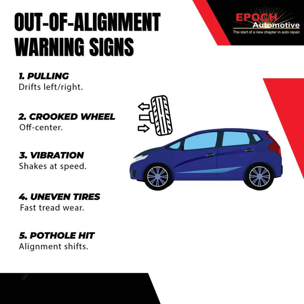 - Your vehicle pulls to one side while driving, indicating possible misalignment that affects safety and control.